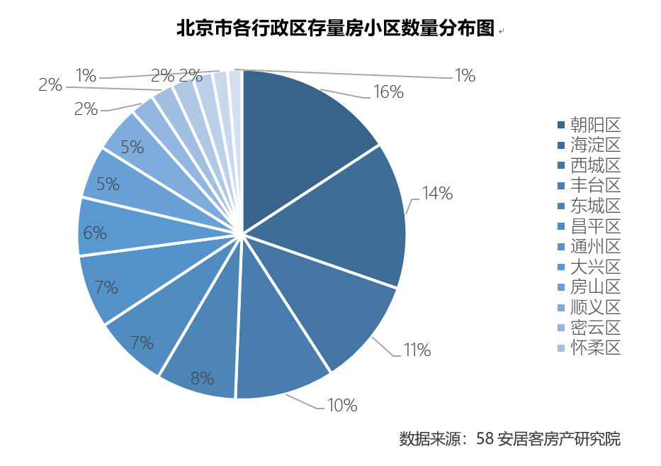 2022年,北京市存量房小区近2万个。其中一半的存量房小区分布在朝阳区、海淀区、西城区、丰台区这四个区域,占比分贝为16%、15%、11%和10%,也是北京市存量房小区最多的区域。平谷区、延庆区、门头沟区、石景山区和怀柔区这五个区域的存量房小区数量相对会较少,占比在2%左右的水平。其他几个区域的存量房小区基本相当,占比都在5-8%之间。