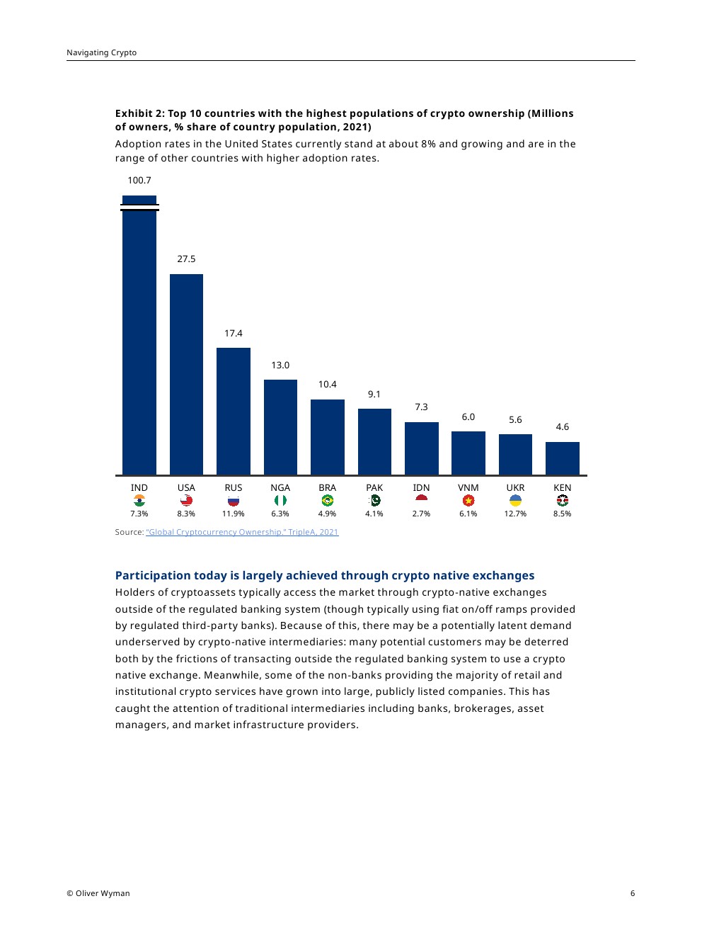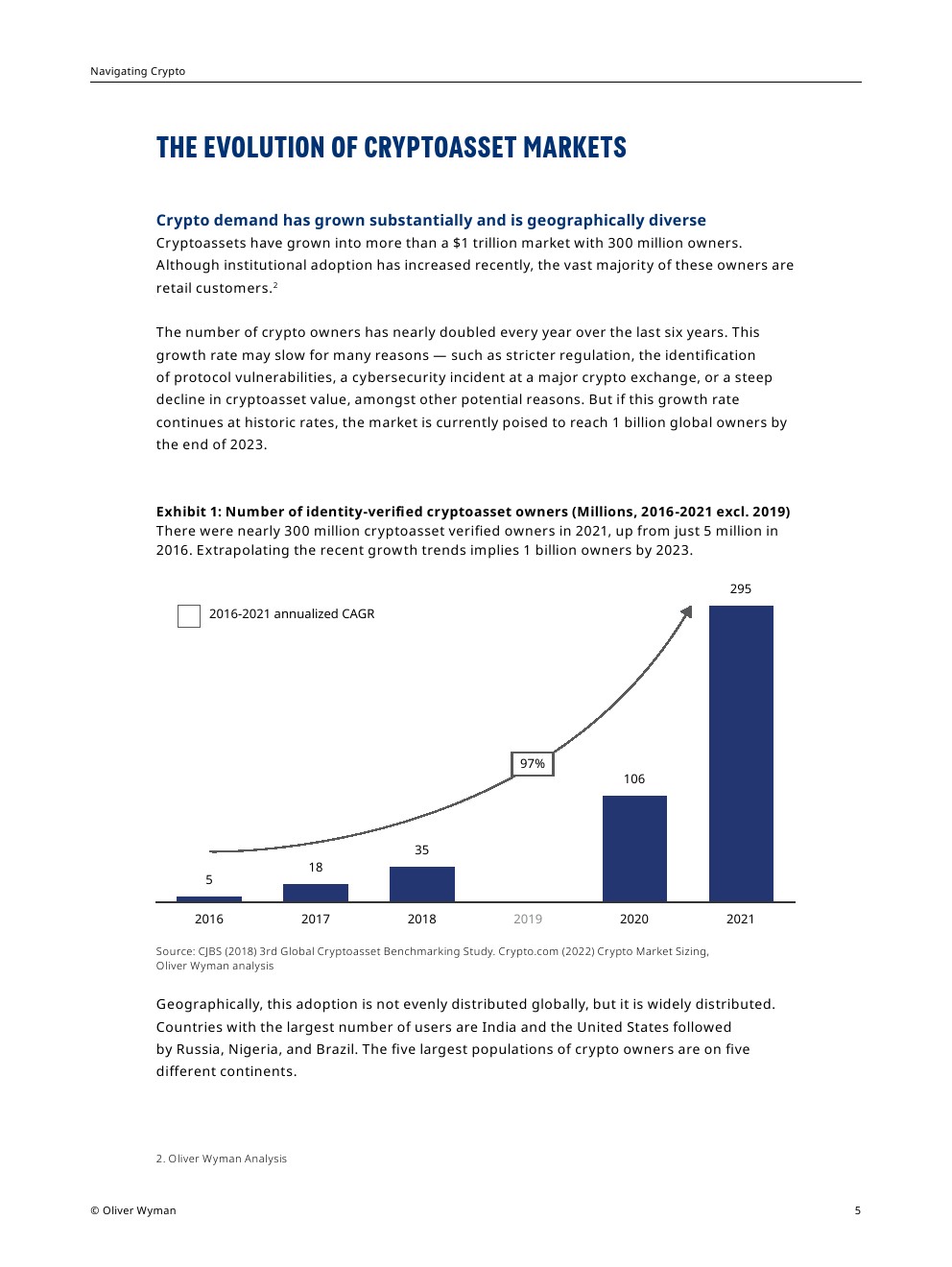 加密货币需求大幅增长,并且在地域上多样化。加密资产已经发展成为一个拥有3亿所有者的超过1万亿美元的市场。尽管最近机构采用有所增加,但这些所有者中的绝大多数是零售客户。