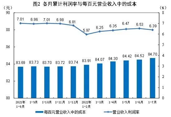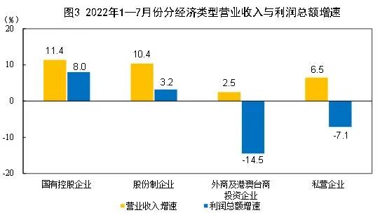 国家统计局:2022年1—7月份全国规模以上工业企业利润下降1.1% 1—7月份,全国规模以上工业企业实现利润总额48929.5亿元,同比下降1.1%(按可比口径计算,详见附注二)。 1—7月份,规模以上工业企业中,国有控股企业实现利润总额17370.6亿元,同比增长8.0%;股份制企业实现利润总额36347.3亿元,增长3.2%;外商及港澳台商投资企业实现利润总额10935.3亿元,下降14.5%;私营企业实现利润总额13116.5亿元,下降7.1%。 1—7月份,采矿业实现利润总额9961.1亿元,同比增长1.05倍;制造业实现利润总额36217.2亿元,下降12.6%;电力、热力、燃气及水生产和供应业实现利润总额2751.2亿元,下降12.5%。 1—7月份,在41个工业大类行业中,16个行业利润总额同比增长,25个行业下降。主要行业利润情况如下:煤炭开采和洗选业利润总额同比增长1.41倍,石油和天然气开采业增长1.19倍,电气机械和器材制造业增长18.4%,化学原料和化学制品制造业增长9.3%,有色金属冶炼和压延加工业增长5.1%,专用设备制造业下降2.6%,农副食品加工业下降7.5%,非金属矿物制品业下降8.2%,计算机、通信和其他电子设备制造业下降9.6%,纺织业下降10.3%,电力、热力生产和供应业下降12.0%,通用设备制造业下降12.8%,汽车制造业下降14.4%,石油、煤炭及其他燃料加工业下降44.0%,黑色金属冶炼和压延加工业下降80.8%。 1—7月份,规模以上工业企业实现营业收入76.57万亿元,同比增长8.8%;发生营业成本64.85万亿元,增长10.0%;营业收入利润率为6.39%,同比下降0.63个百分点。 7月末,规模以上工业企业资产总计149.68万亿元,同比增长10.0%;负债合计85.08万亿元,增长10.5%;所有者权益合计64.60万亿元,增长9.4%;资产负债率为56.8%,同比提高0.2个百分点。 7月末,规模以上工业企业应收账款20.69万亿元,同比增长14.2%;产成品存货6.01万亿元,增长16.8%。 1—7月份,规模以上工业企业每百元营业收入中的成本为84.70元,同比增加0.95元;每百元营业收入中的费用为7.93元,同比减少0.50元。 7月末,规模以上工业企业每百元资产实现的营业收入为89.9元,同比减少1.2元;人均营业收入为175.4万元,同比增加15.5万元;产成品存货周转天数为18.4天,同比增加1.0天;应收账款平均回收期为54.2天,同比增加2.7天。 更多阅读:国家统计局:2019年1—8月份全国规模以上工业企业利润下降1.7%国家统计局:2020年1—5月份全国规模以上工业企业利润下降19.3%国家统计局:2023年1-6月份全国规模以上工业企业利润下降16.8% 降幅持续收窄国家统计局:2019年1-6月份全国规模以上工业企业利润下降2.4%国家统计局:2018年1-2月份全国规模以上工业企业利润增长16.1%国家统计局:2017年1-2月全国规模以上工业企业利润总额增31.5%国家统计局:2024年1—5月份全国规模以上工业企业利润增长3.4%国家统计局:2022年1-11月份全国规模以上工业企业利润下降3.6%国家统计局:2024年1-2月份全国规模以上工业企业利润增长 10.2%国家统计局:2022年1—2月份全国规模以上工业企业利润增长5.0%国家统计局:2021 年 1—10 月份全国规模以上工业企业利润同比增长 42.2% 两年平均增长 19.7%国家统计局:2015年1-6月份全国规模以上工业企业利润总额同比下降0.7%国家统计局:2024年1—5月份规模以上工业企业利润保持增长国家统计局:2023年1—7月份全国规模以上工业企业利润下降15.5%国家统计局:2023年1—5月份全国规模以上工业企业利润下降18.8%