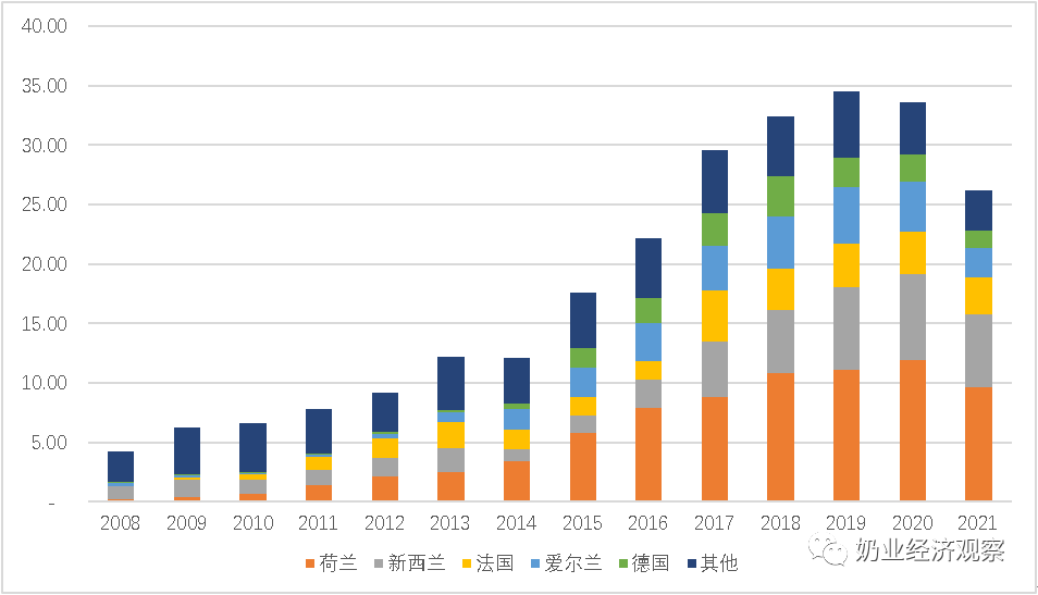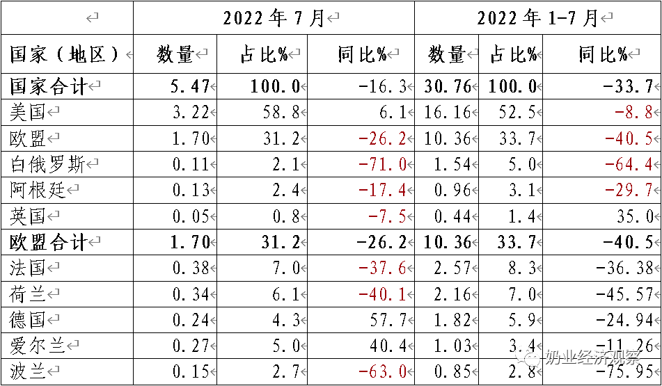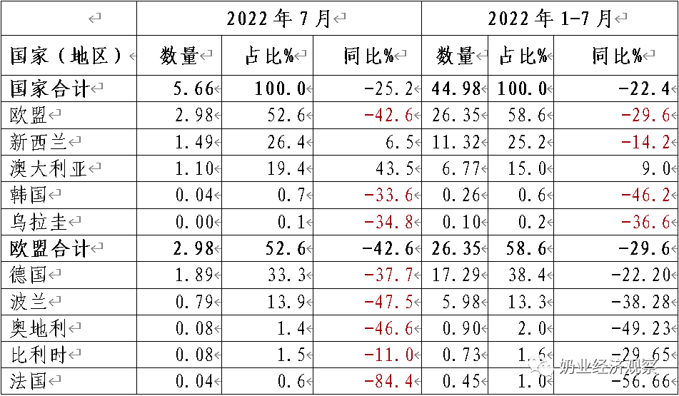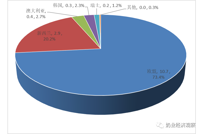 其中,从欧盟进口 10.7 万吨,占 73.4%,同比增加 7.2%;新西兰进口 2.94 万吨,占 20.2%,同比减少 13.7%。