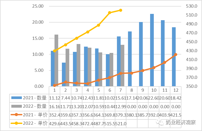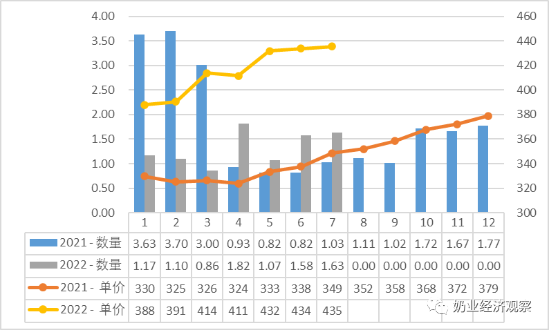 2.2.2液态奶 2022 年 1-7 月出口 + 6.7% 至 17565 吨价格 + 4.9%