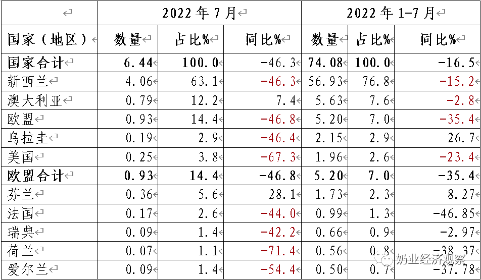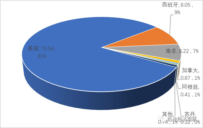 其中,从新西兰进口 56.93 万吨,占 76.8%,同比减少 15.2%;澳大利亚进口 5.63 万吨,占 7.6%,同比减少 2.8%;欧盟进口 5.2 万吨,占 7%,同比减少 35.4%。