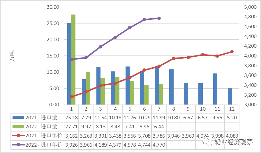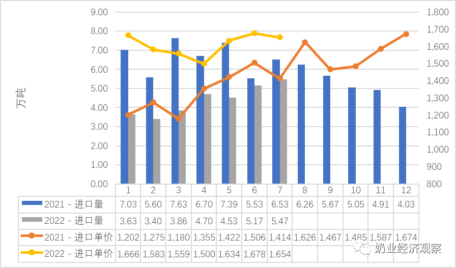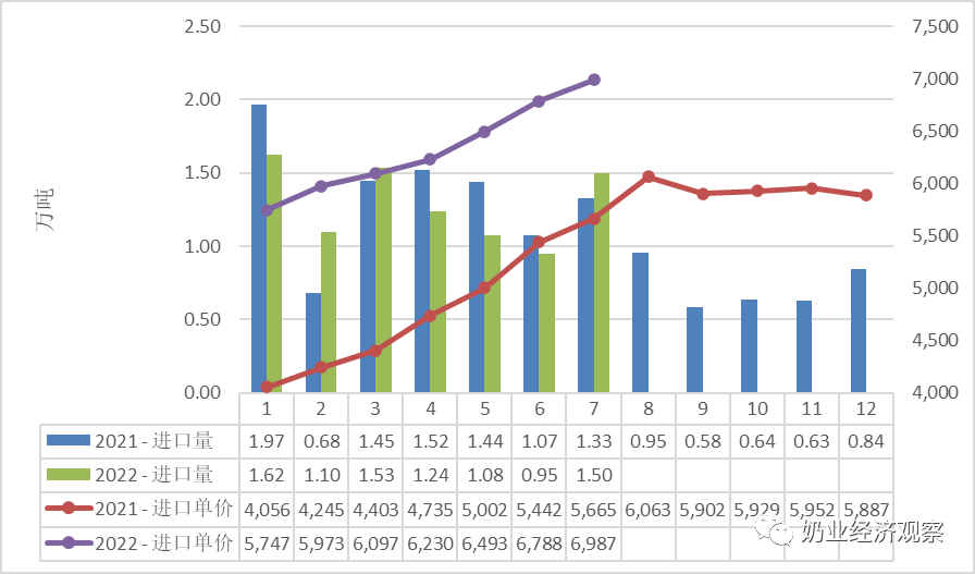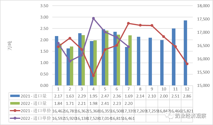 2.1.1 干乳制品 2022 年 1-7 月进口 141.67 万吨同比减少 19.3%
