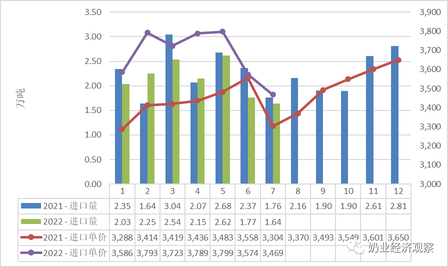 3.1.3稀奶油 1-7 月进口 – 5.7% 至 15 万吨,价格同比 + 8%