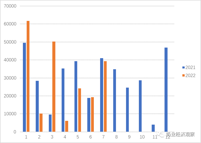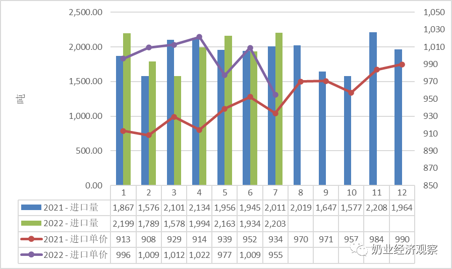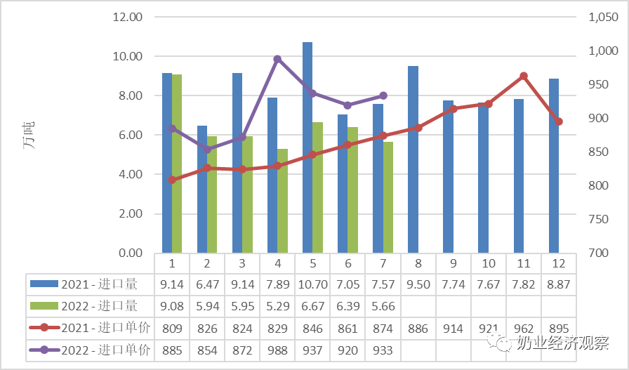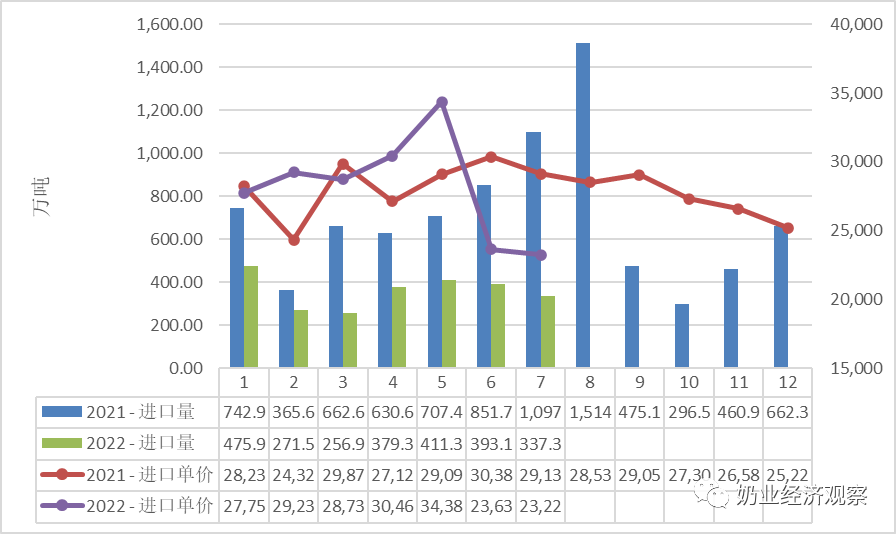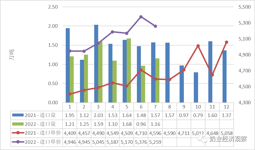据中国海关统计,2022 年 1-7 月中国共进口包装牛奶 44.98 万吨,同比减少 22.4%;进口额 4.09 亿美元,同比减少 15.7%,平均价格为 910 美元 / 吨,同比上涨 8.6%。