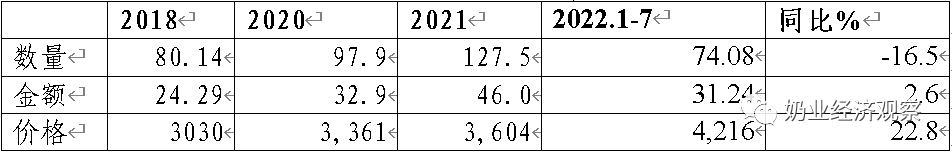 据中国海关统计,2022 年 1-7 月中国共进口稀奶油 15 万吨,同比减少 5.7%;进口额 5.54 亿美元,同比增加 1.8%,平均价格为 3692 美元 / 吨,同比上涨 8%。