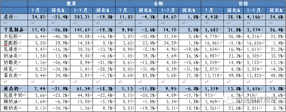 7 月中国共进口酸奶类 0.13 万吨,同比减少 34.7%,进口额 0.03 亿美元,同比减少 19.3%,平均价格为 2361 美元 / 吨,同比上涨 23.6%。