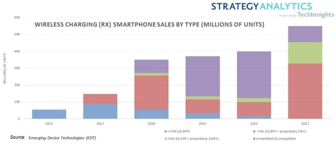 Strategy Analytics:预计2022年无线充电智能手机销量超过4亿部 到2022年,无线充电智能手机销量将超过4亿部。未经认证的Qi设备占主导,这是由于渗透仅限于高端和超高端手机。专有解决方案>5W (Qi BPP +专有5W+)和>5W (Qi EPP +专有15W+)出货量将在2027年占80% 更多阅读:Strategy Analytics:2021年全球无线充电智能手机达10亿台 亚太地区占比高达49%Strategy Analytics:2021年Q1全球智能手机批发总收入超过1000亿美元Strategy Analytics:2019年Q2全球平板电脑出货量市场份额Strategy Analytics:2021年Q2全球智能手机出货量同比增长11%,达到3.142亿部MarketsandMarkets:预计2017年全球无线充电市场达71.6亿美元2020年全球无线充电智能手机市场存量区域份额(附原数据表) Strategy Analytics:2021年Q4全球平板电脑出货量同比下降25%Strategy Analytics:预计2021年TWS耳机批发均价将同比下降19%Strategy Analytics:预计2021年Q3 MacBook出货量为650万台Strategy Analytics:2021年Q1全球笔记本出货量同比增长81%Strategy Analytics:2022年Q3中国笔记本电脑出货量仅5610万台Strategy Analytics:2021年基于Arm的移动计算芯片市场达到351亿美元Strategy Analytics:2022年第一季度全球笔记本电脑出货量达6350万台Strategy Analytics:2021年移动计算设备收益将实现两位数增长Strategy Analytics:2021年Q1苹果A系列和M系列应用处理器达到20亿美元 收益飙升54%