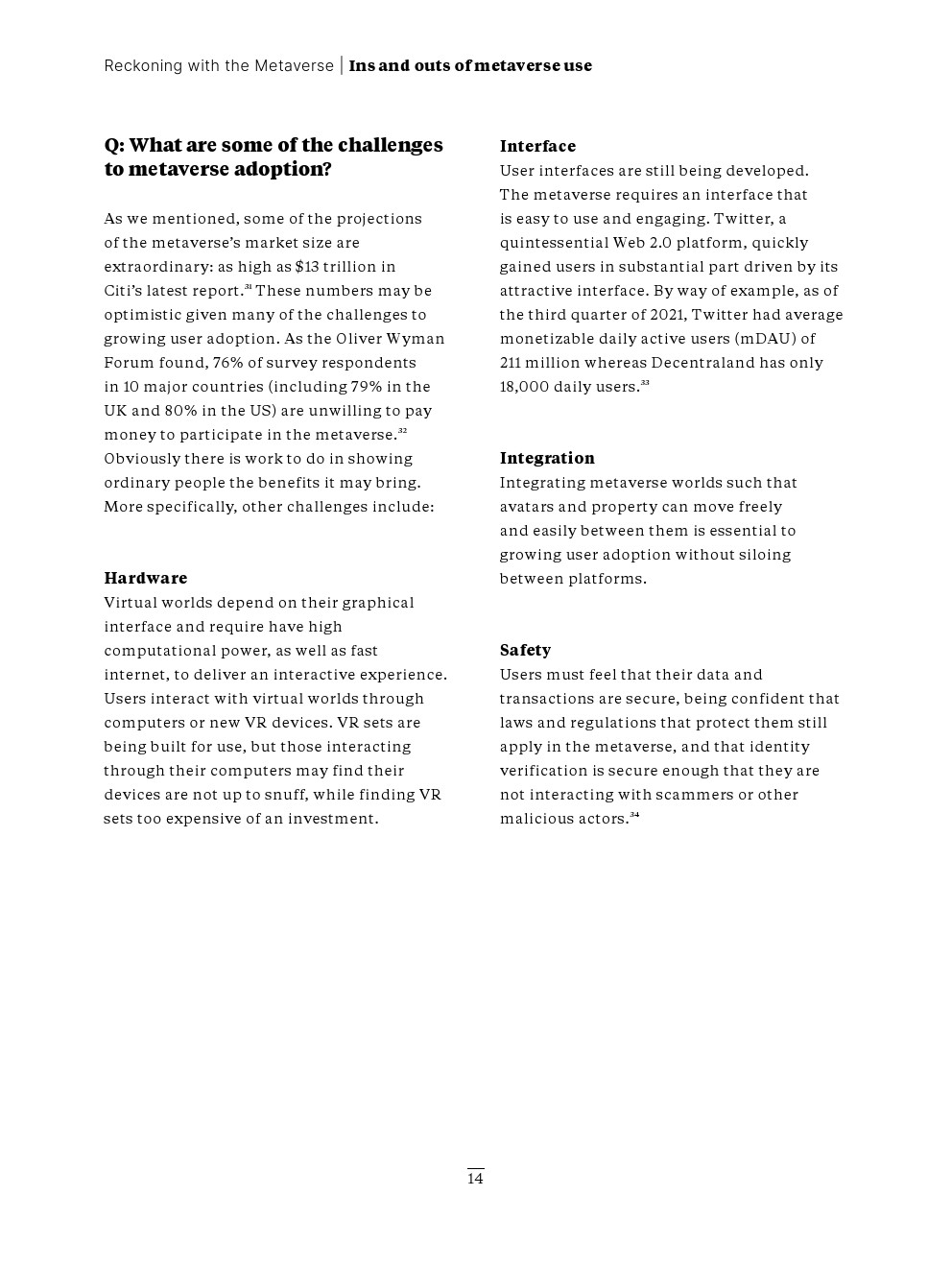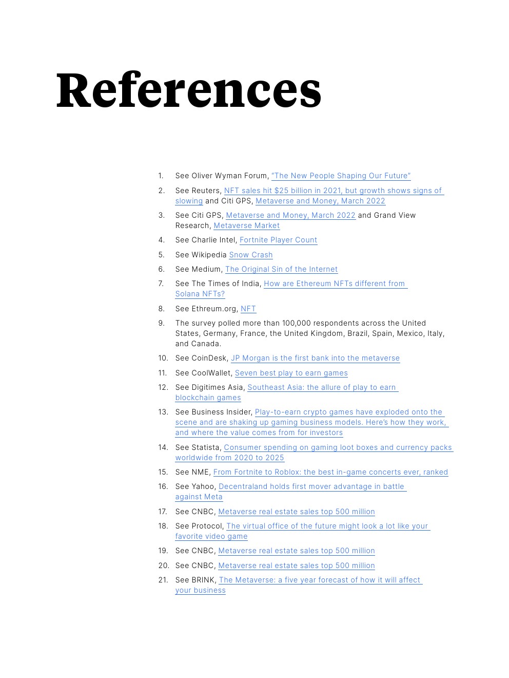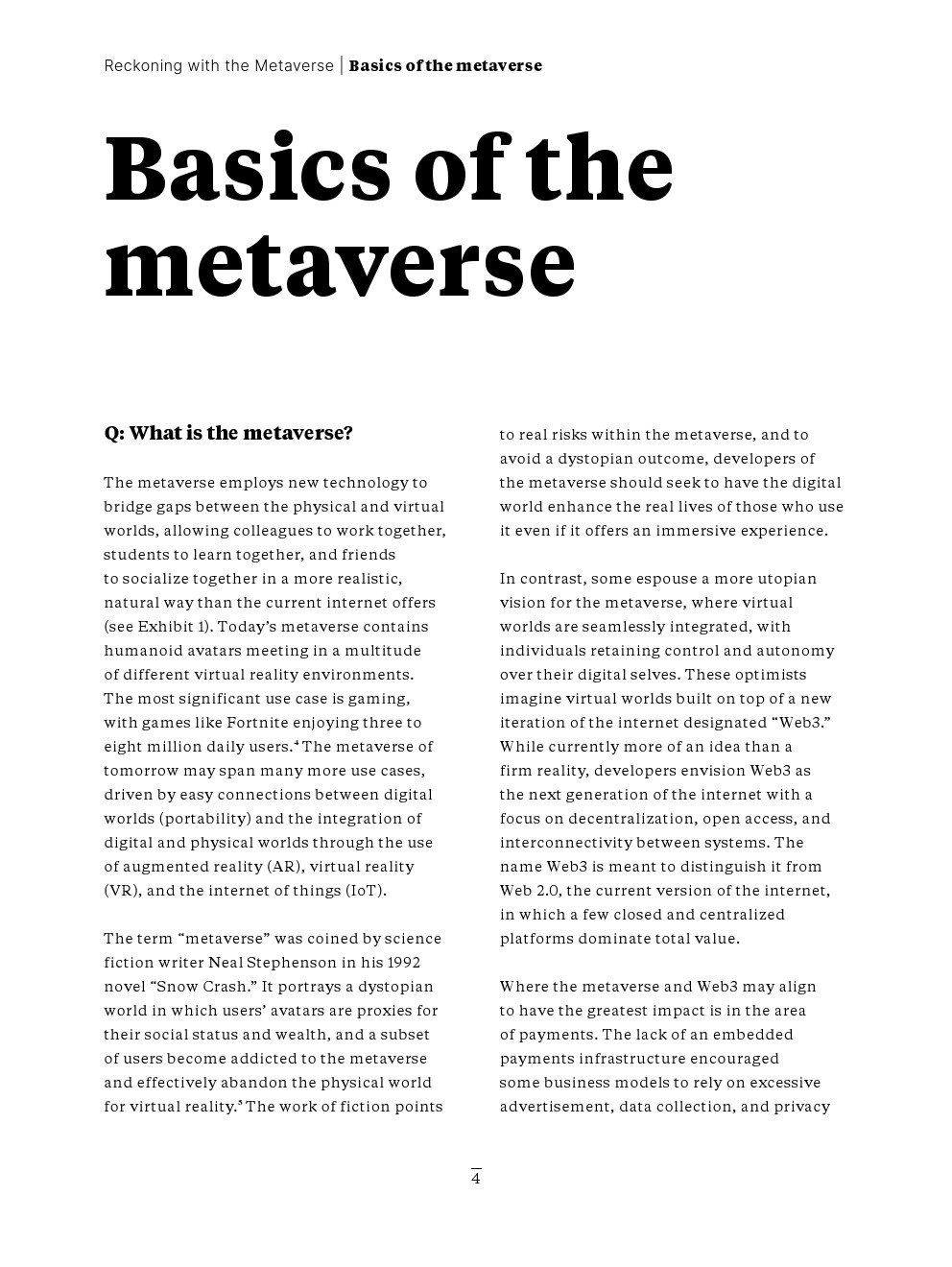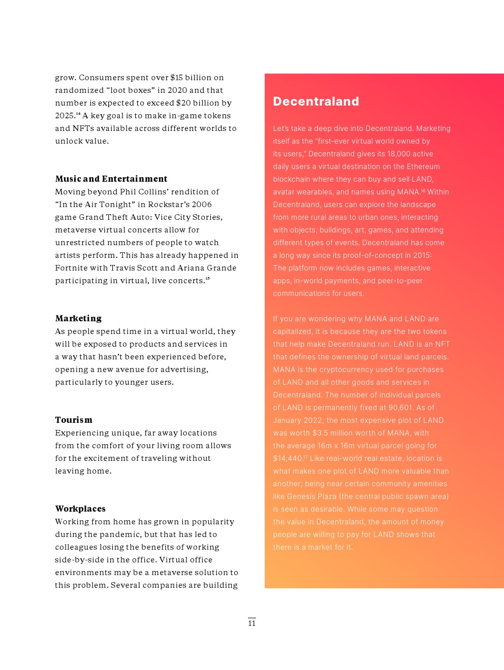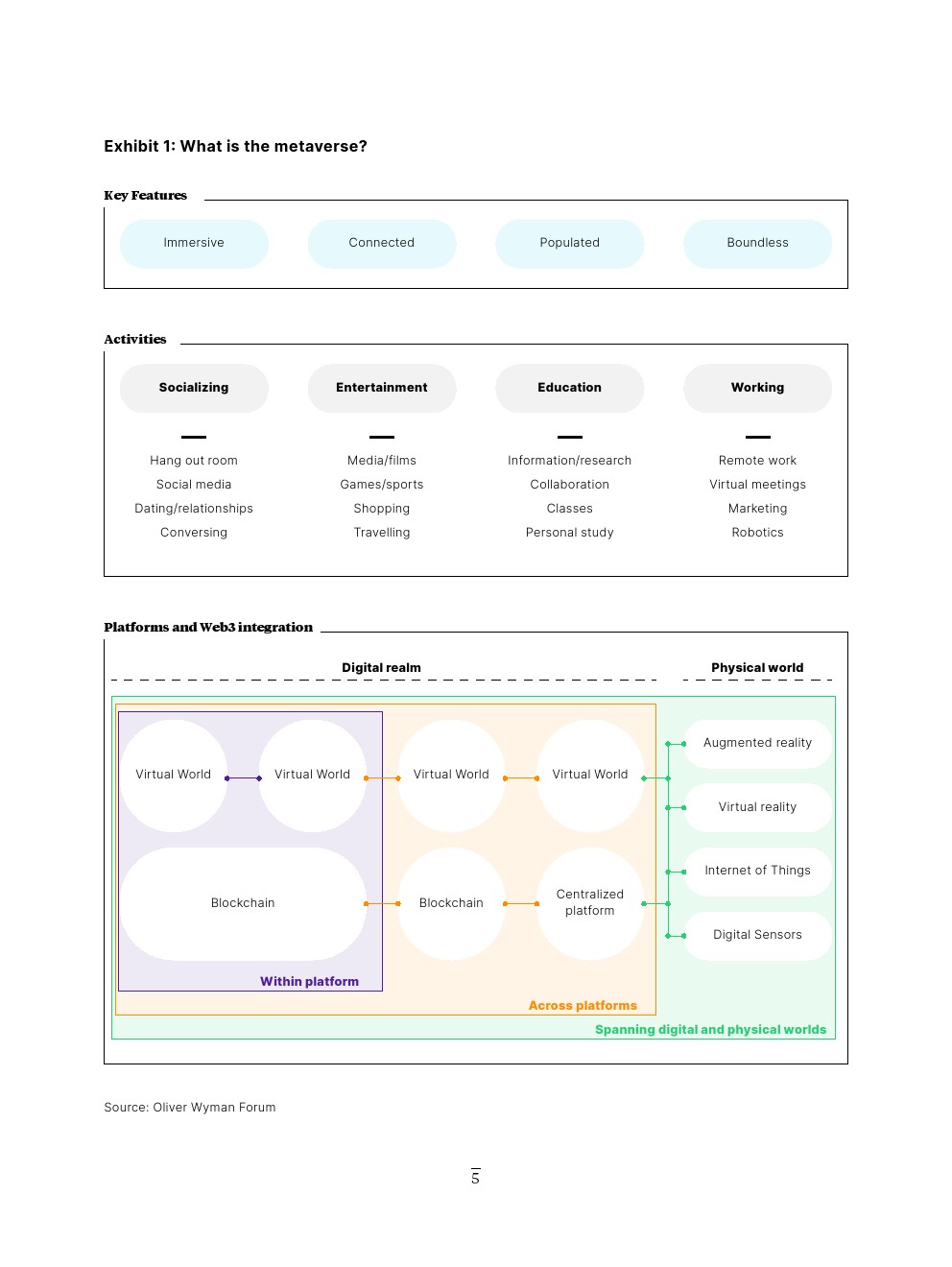 元宇宙采用新技术来弥合物理世界和虚拟世界之间的鸿沟,让同事们一起工作,让学生一起学习,让朋友们以一种比当前互联网提供的更现实、更自然的方式一起社交。今天的元宇宙包含众多不同的虚拟现实环境中的人形化身。最重要的用例是游戏,像《堡垒之夜》这样的游戏每天拥有300-800万用户。未来的元宇宙可能会跨越更多用例,这得益于数字世界之间的轻松连接以及通过使用增强现实(AR)、虚拟现实(VR)和物联网(IoT)数字和物理世界的集成。