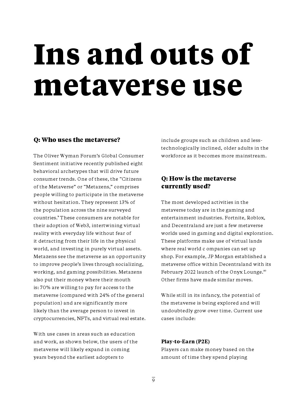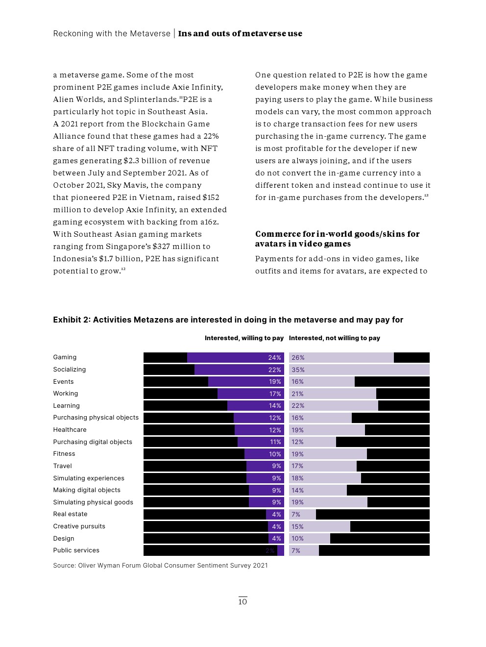 奥纬论坛的全球消费者情绪倡议最近发布了8种将推动未来消费趋势的行为原型。其中之一是“元宇宙公民”或“元宇宙”,包括愿意毫不犹豫地参与元宇宙的人。他们占9个被调查国家人口的13%。这些消费者以采用 Web3、将虚拟现实与日常生活交织在一起而不担心它会影响现实世界中的生活以及投资的虚拟资产而著称。70%的受访者愿意为访问元宇宙付费(相比之下,24%的普通人这么认为),并且比普通人更有可能投资于加密货币、NFT 和虚拟现实财产。
