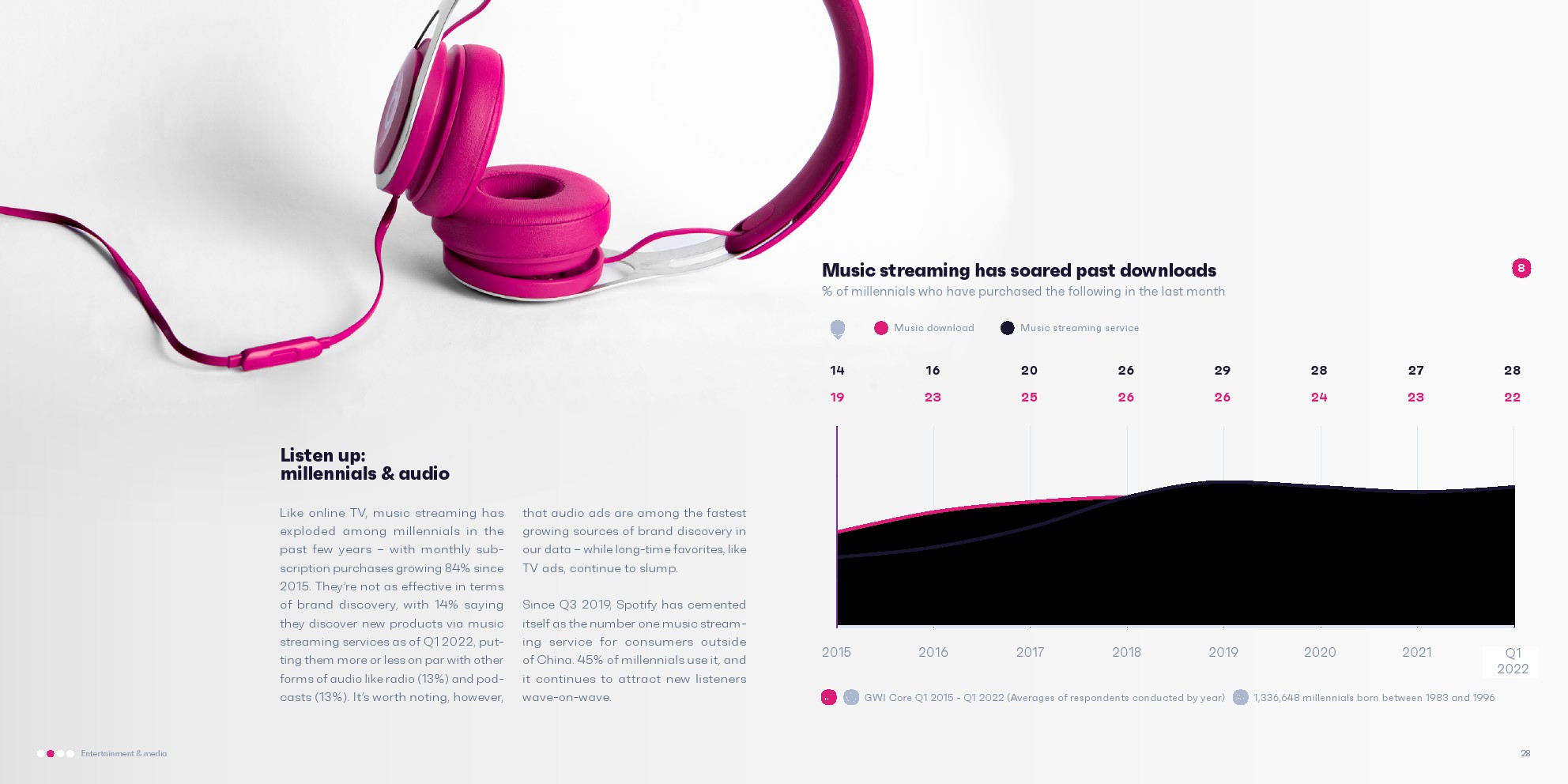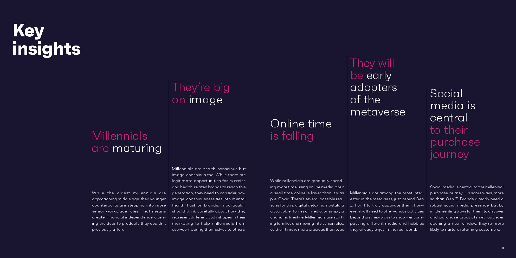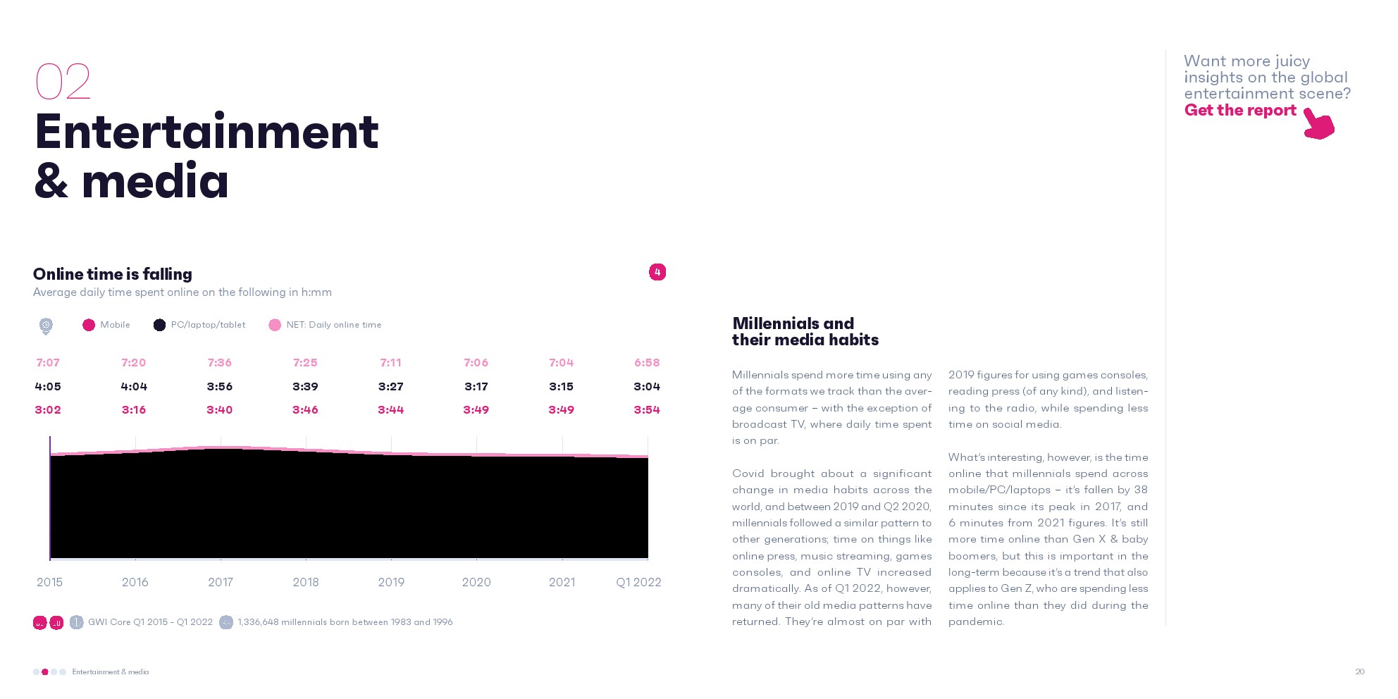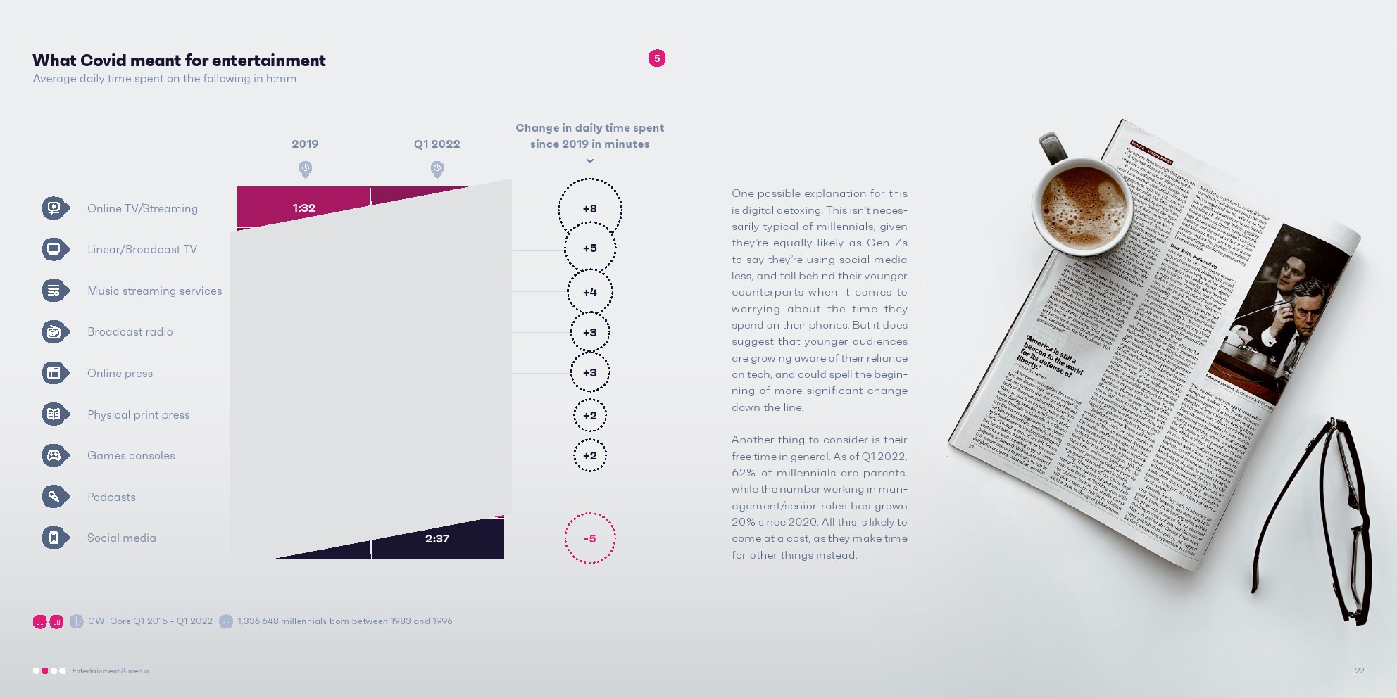 尽管千禧一代逐渐花更多时间访问在线媒体,但他们的总体在线时间低于新冠疫情之前。这有几个可能的原因:数字排毒,对旧媒体形式的怀旧,或者仅仅是生活方式的改变。千禧一代开始组建家庭并担任高级职务,因此他们的时间比以往任何时候都更加宝贵。