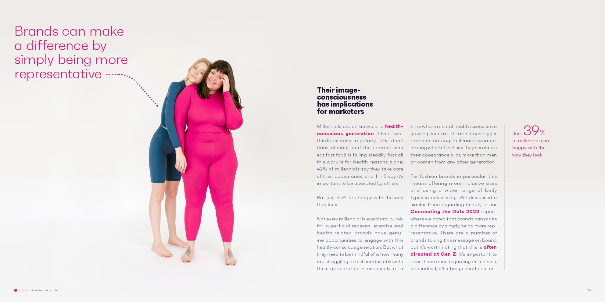 千禧一代注重健康,但也注重形象。虽然运动和健康相关品牌有合法的机会接触这一代人,但他们需要考虑形象意识如何与心理健康联系起来。尤其是时尚品牌,应该仔细考虑他们在营销中如何代表不同的体型,以帮助千禧一代避免将自己与他人进行过度比较。