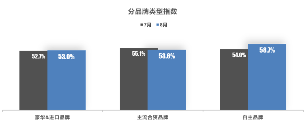 从分品牌类型指数看:从分品牌类型情况看,8月进口&豪华品牌、自主品牌指数环比上升, 主流合资品牌指数环比下降。