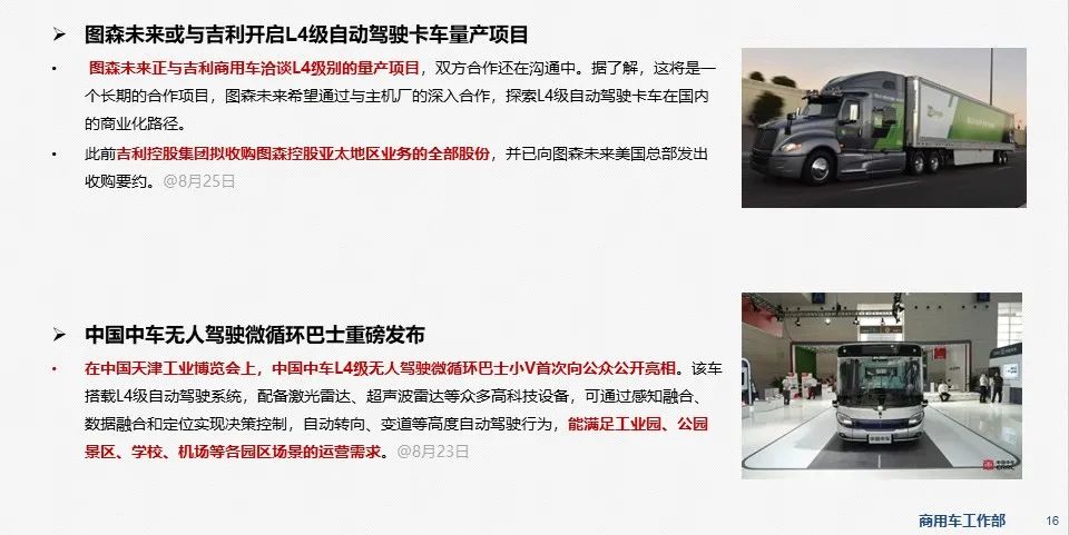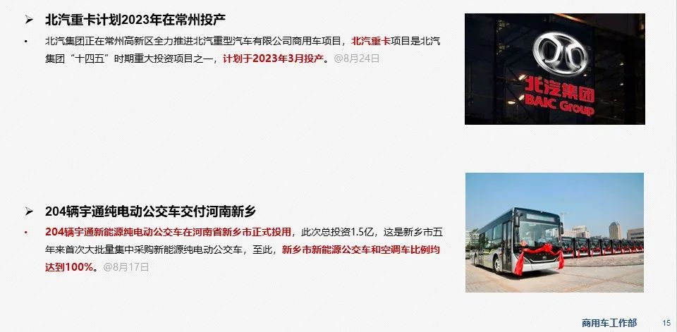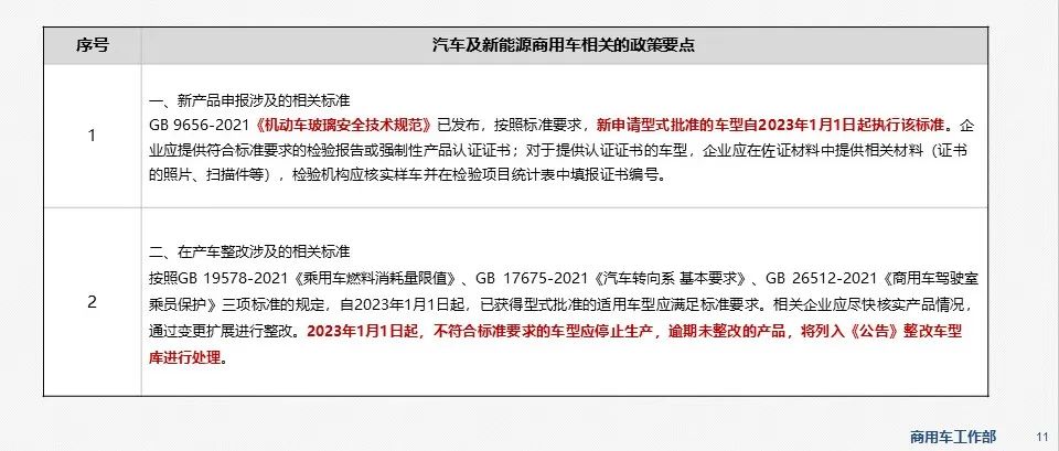 - 8月24日,工信部装备中心发布了“关于做好《公告》标准实施整改工作的通知”,2023年1月1日起将实施一批新标准,包含新产品申报涉及的相关标准和在产车整改涉及的相关标准,按要求补充提供相关检验报告。