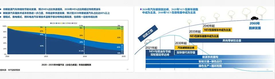 - 观点③:技术路线发展——节能汽车与新能源汽车长期共存协同发展,纯电动汽车将逐渐成为市场主流。2030年汽车碳排放达峰,2035年NEV在新车销售 中成为主流,2040年NEV在保有量中成为主流