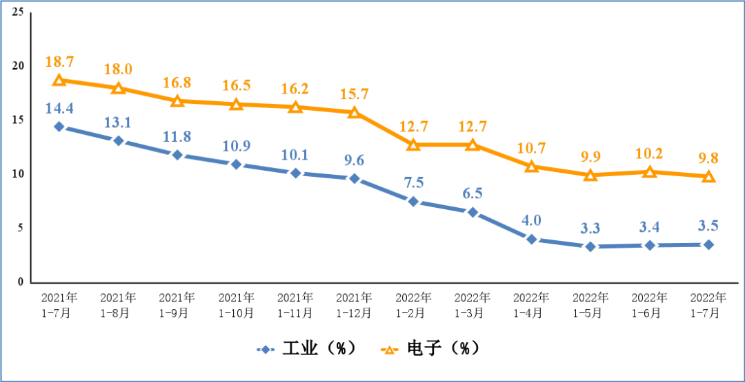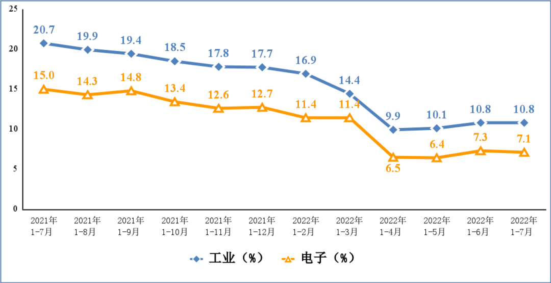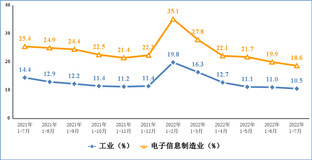 1—7月份,规模以上电子信息制造业增加值同比增长9.8%,增速分别超出工业、高技术制造业6.3和3.9个百分点。7月份,规模以上电子信息制造业增加值同比增长7.3%,较6月份回落3.7个百分点。