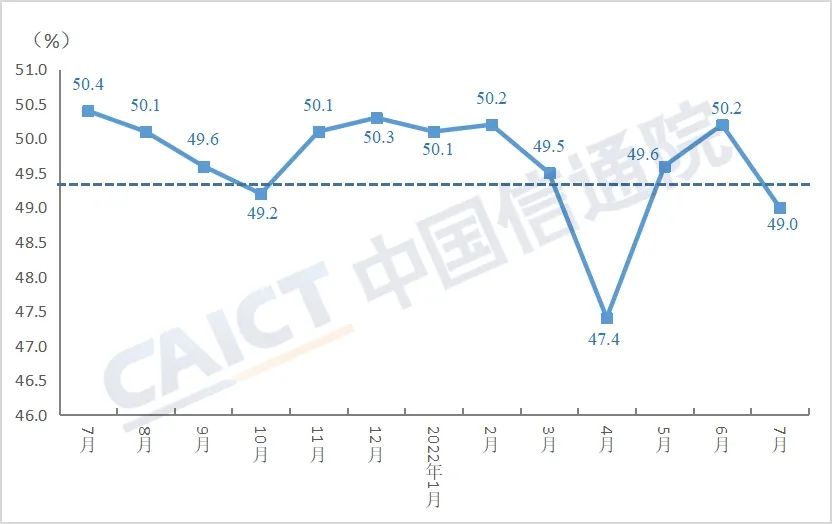 制造业采购经理指数有所回落。7月份,制造业采购经理指数为49.0%,比上月下降1.2个百分点,位于临界点以下,经济景气水平有所回落。从分类指数看,生产指数、新订单指数、原材料库存指数和从业人员指数均低于临界点。生产指数和新订单指数分别为49.8%和48.5%,比上月下降3.0和1.9个百分点,均位于收缩区间,说明生产需求不足。从行业情况看,专用设备、汽车、铁路船舶航空航天设备等行业PMI高于52.0%,连续两个月保持扩张,产需持续恢复。纺织、石油煤炭及其他燃料加工、黑色金属冶炼及压延加工等高耗能行业PMI继续位于收缩区间,明显低于制造业总体水平,是本月PMI回落的主要因素之一。