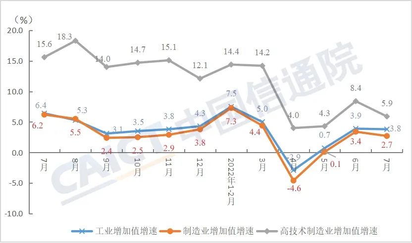工业生产保持平稳增长,高技术产业增长较快。7月份,随着稳经济大盘一揽子政策措施持续显效,工业生产延续5月份以来恢复态势,规模以上工业增加值同比增长3.8%,总体保持平稳运行。1-7月份,全国规模以上工业增加值同比增长3.5%,增速较上半年加快0.1个百分点。制造业增速有所下滑。7月份,制造业增加值同比增长2.7%,较上月增速下滑0.6个百分点。1-7月份,制造业增加值同比增长2.7%,低于同期工业增加值增速0.8个百分点。高技术制造业快速增长。7月份,高技术制造业增加值同比增长5.9%,增速比上月有所回落,但仍高于规模以上工业增加值增速2.1个百分点。其中,航空航天器及设备制造业、电子及通信设备制造业同比分别增长12.9%、12.0%,保持两位数增长。1-7月份,高技术制造业增加值同比增长9.0%,高于同期工业增加值增速6.5个百分点,对工业生产持续性恢复提供有力支撑。