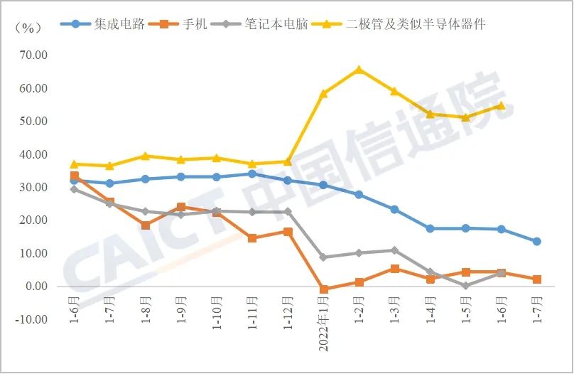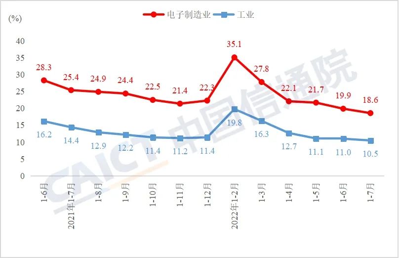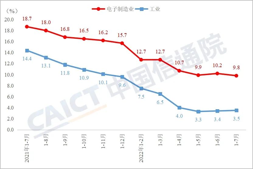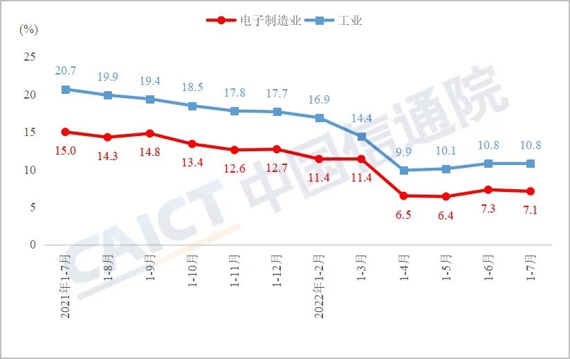 生产维持较快增长。2022年1-7月,规模以上电子制造业增加值累计增长9.8%,高于工业总体6.3个百分点。其中,7月规模以上电子制造业增加值同比增长7.3%,较6月增速回落3.7个百分点。