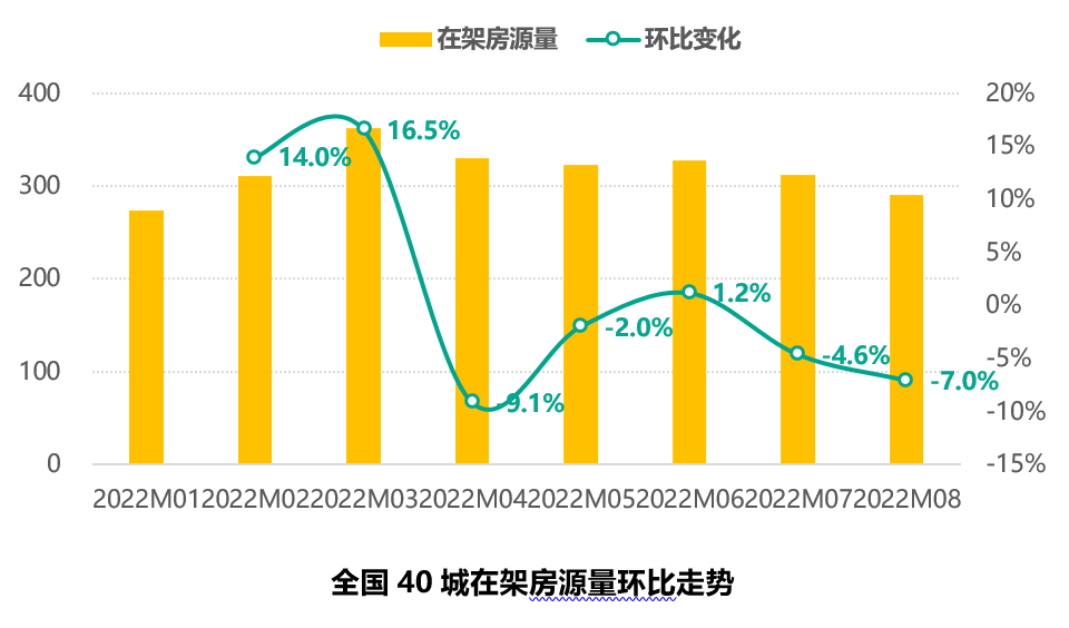 据58安居客房产研究院统计数据显示:2022年8月,全国40城二手房在架套数在290万套左右的水平,相比7月减少7.0%。从当前在架房源持续出现减少的情况来看,几乎所有的城市都出现回落,其中三亚在架房源的最大跌幅近30%;在架房源上涨的城市仅有五个,分别是北京、兰州、南昌、宁波和长春。