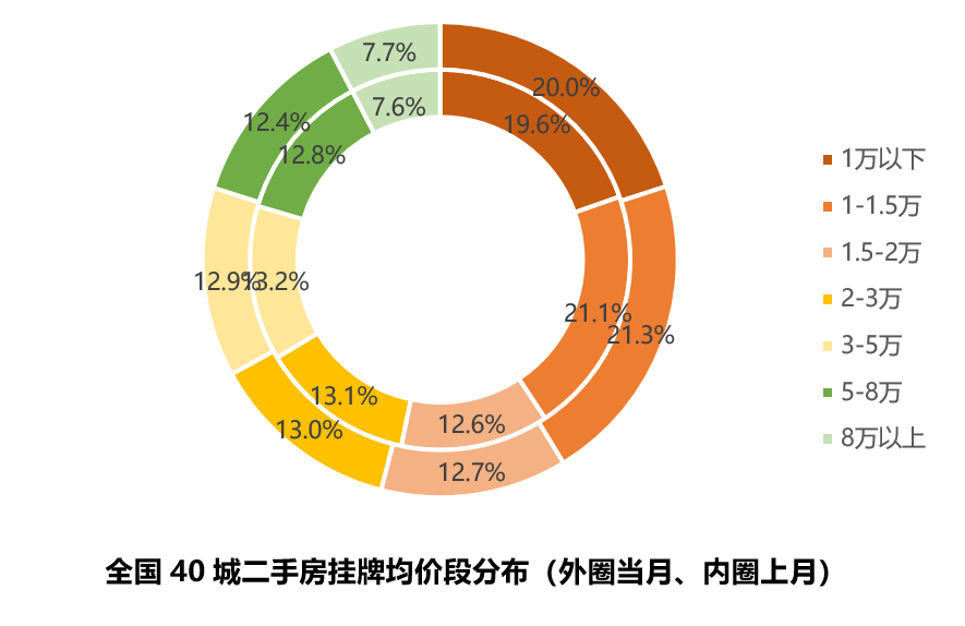 2022年8月,全国40城二手房挂牌均价主要集中在1.1.-1.5万元/平方米这个价格段之间,占比为21.3%,相比上月增加0.2个百分点,1万元/平方米以下的房源增加0.4个百分点,1.5-2万元/平方米的房源增肌0.1个百分点。8月全国二手房中低端的房源出现明显增长,而高端的房源占比出现一定的回落。