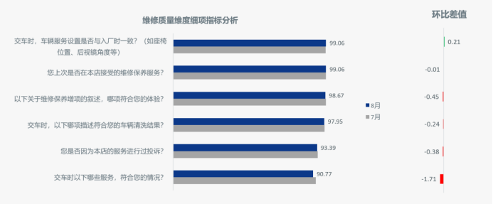 本月售后服务五维度得分均是环比下降,其中维修质量维度下降0.72分,服务设施维度下降0.64分。