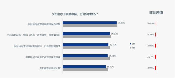 在深入分析“交车时以下哪些服务,符合您的情况?”指标,环比7月,各服务细节均是环比下降。