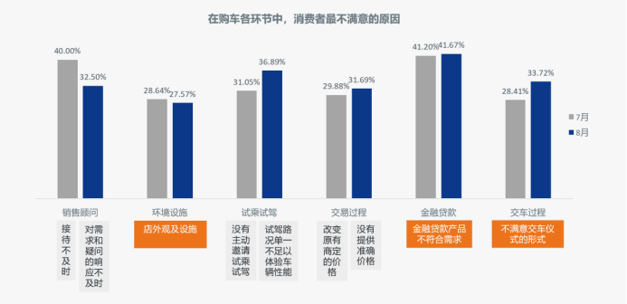 《报告》深入分析消费者在各服务环节中最不满意的原因,在环境设施环节中仍然是对“店外观及设施(布局不合理、不整洁等)”最不满意,金融贷款环节中仍然是对“金融贷款产品不符合需求”最不满意,交车过程中仍然是对“不满意交车仪式的形式”最不满意。且不满意的占比从7月的28.41%提升至33.72%。