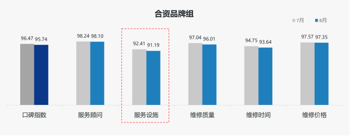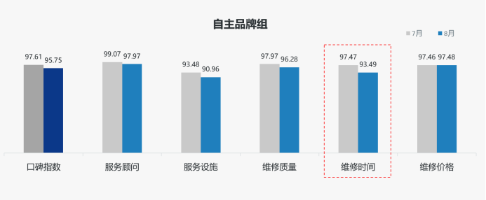 自主品牌组:售后服务口碑指数为95.75分,环比下降1.86分;本月售后服务五维度得分中,除维修价格维度基本持平外,其他维度环比下降明显,尤其是维修时间维度下降最多,达3.98分。