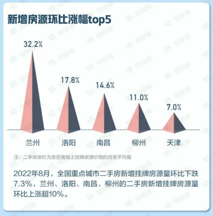 市场供应方面,统计数据显示,8月全国新增挂牌房源量环比下跌7.3%,北京环比上涨6.9%。从全国范围来看,兰州环比涨幅达32.2%,洛阳、南昌、柳州、天津等城市新增挂牌房源量也相对较高,环比均出现10%左右的涨幅。