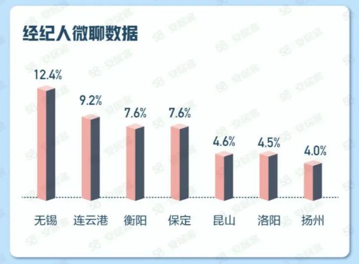 2022年8月,经纪人信心指数为95.8,环比下跌2.3%,50%的经纪人认为9月份二手房价格将与8月基本持平,同时33.5%的经纪人认为9月份二手房成交量也将与8月相当。此外,58同城、安居客还对经纪人微聊使用数据进行了统计分析,数据显示,无锡、连云港、衡阳、保定、昆山、洛阳、扬州等地购房者与经纪人的沟通显著增多。