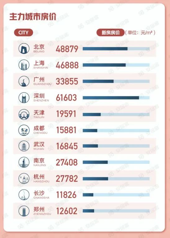 数据显示,8月全国重点监测的65城新房线上均价为17593元/㎡,环比上涨0.04%,65城中有29城新房房价环比上涨。一线城市中,深圳新房线上均价为61603元/㎡,北京为48879元/㎡,上海新房为46888元/㎡,广州为33855元/㎡。新一线城市中,杭州新房线上均价为27782元/㎡,南京为27408元/㎡。