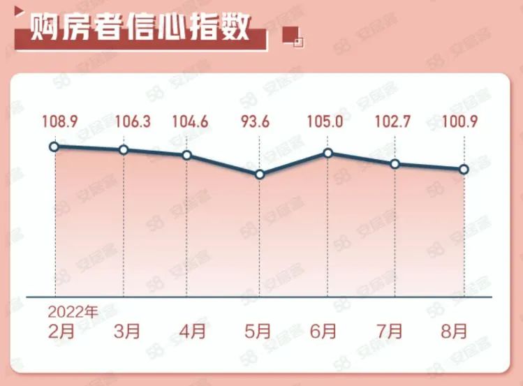 2022年8月,购房者信心指数为100.9,环比微跌1.8%,44.4%的购房者认为今年9月房价将基本持平,另外有32.8%的购房者认为9月楼市成交套数走势也将基本保持平稳。