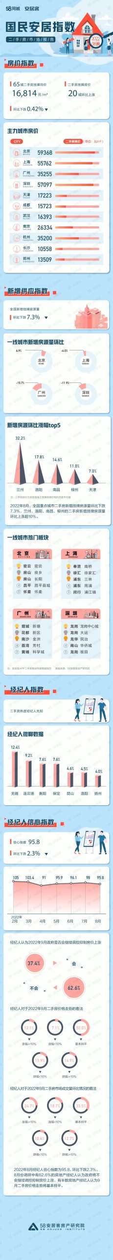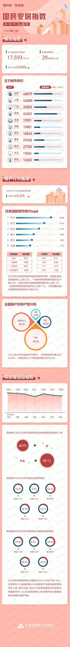 58同城、安居客发布2022年《8月国民安居指数报告》。报告显示,2022年8月全国重点监测65城新房线上均价环比微涨0.04%,其中有29城新房房价环比上涨,北京找房热度上升显著,环比上涨5.1%,三居室户型热度相对较高;二手房挂牌均价环比下跌0.42%,其中有20城二手房挂牌房价环比上涨,兰州、洛阳、南昌、柳州、天津等城市新增挂牌房源量涨幅显著。