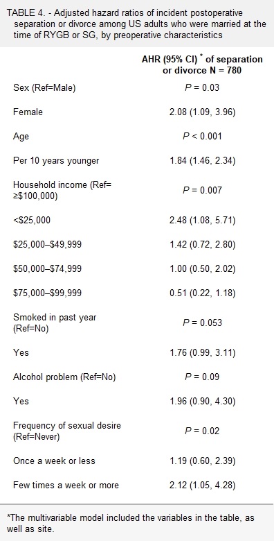 表 4 – 手术时已婚成年人,在术后分居或离婚的风险调整比。