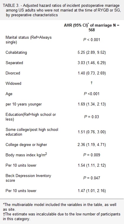 表 3 – 根据术前特征,美国成年人的术后婚姻风险比。