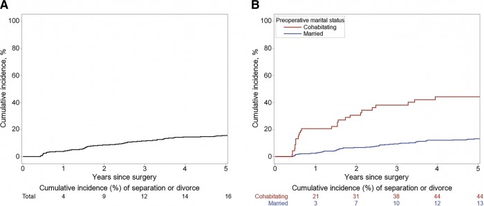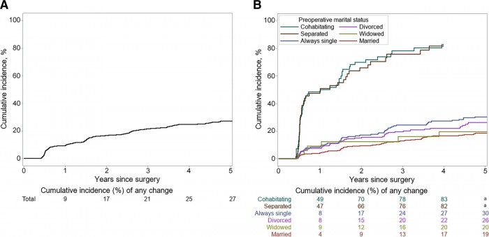 研究配图 1 – 在所有参与者中,术后婚姻状况发生变化的累积发生率。