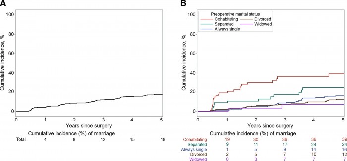研究配图 2 – 在未婚参与者中,术后结了婚的累积发生率。