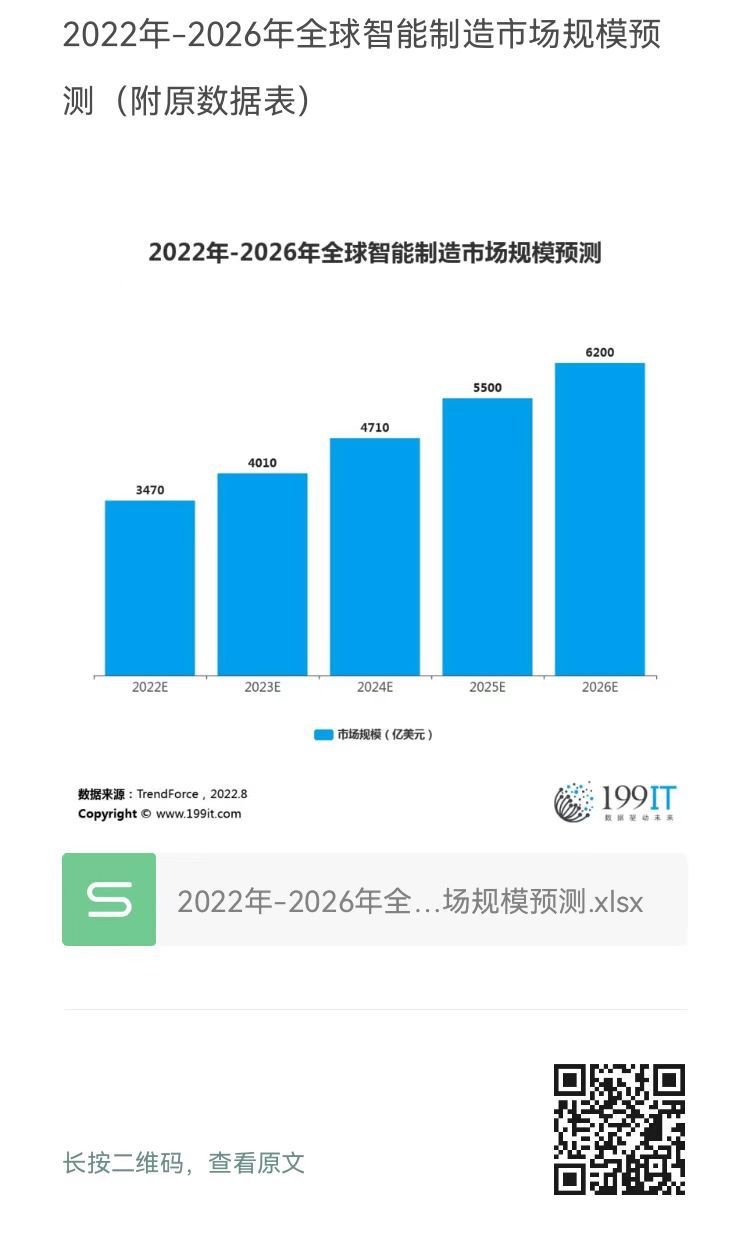 2022年-2026年全球智能制造市场规模预测(附原数据表) 更多阅读:制造业智能化的下一站——人与机器的协作Plex:2022年智能制造商报告TrendForce:预计2025年工业元宇宙催动全球智能制造市场规模达5,400亿美元2016中国智能制造发展六大趋势中国智能制造发展研究报告:能力成熟度Plex:2022年智能制造报告TrendForce:2026年全球智能制造市场将达到6200亿美元智能制造、工业4.0和数字化制造的异同2020长沙网络安全·智能制造大会在长沙召开共赢科技创新发展新机遇——2020长沙网络安全·智能制造大会TrendForce:2024年智能制造市场规模将达4000亿美元2020第二届全球制造业数字化转型国际峰会2016中国智能制造产业回顾与展望Oracle NetSuite与友达智汇战略合作 赋能制造企业全面数智化CESI:智能制造发展指数报告(2021)