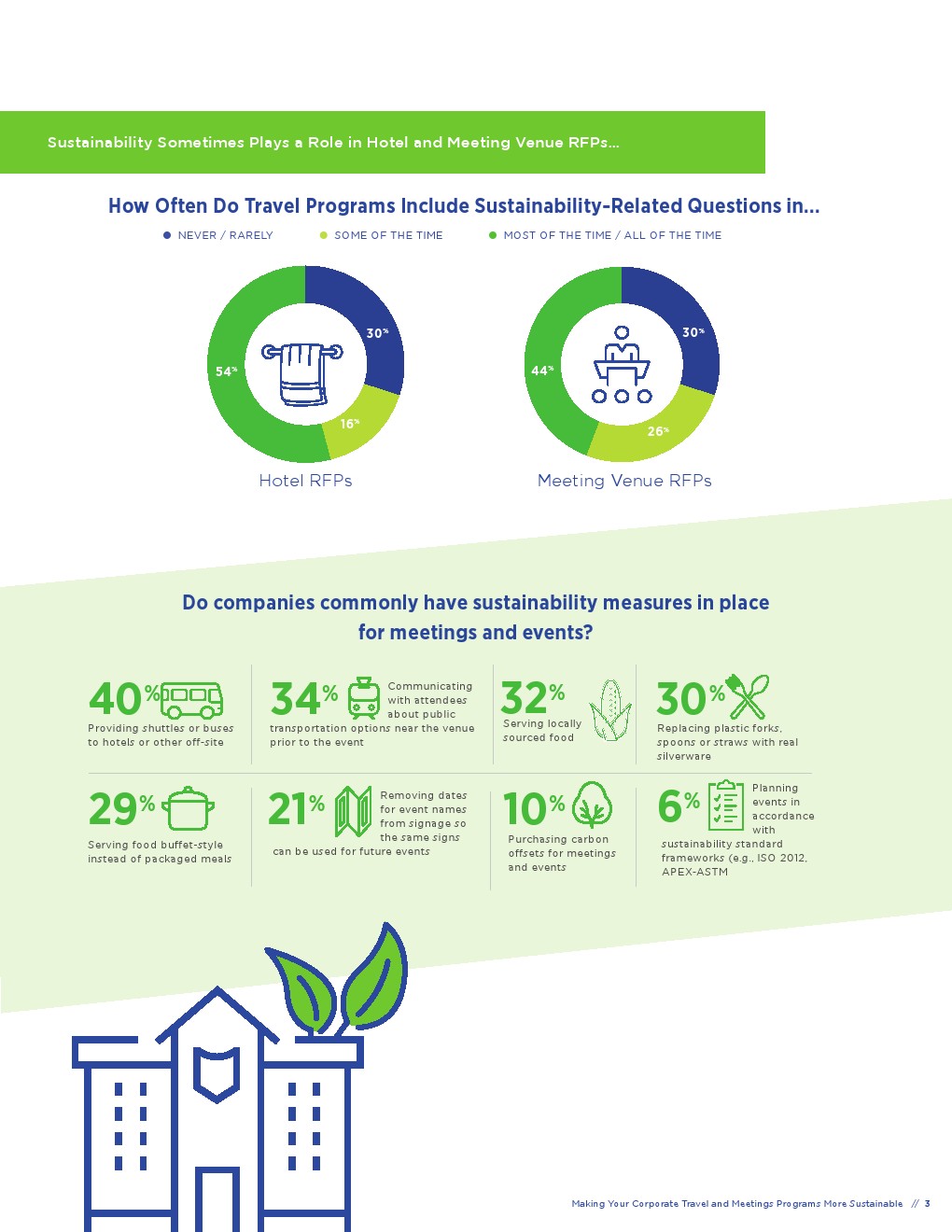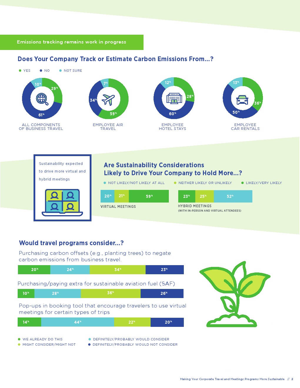购买碳补偿(例如植树)以抵消商务旅行的碳排放:20%的公司“已经这样做了”,24%“可能会考虑”,34%“可能考虑/可能不考虑”,23%选择“可能不会考虑”。