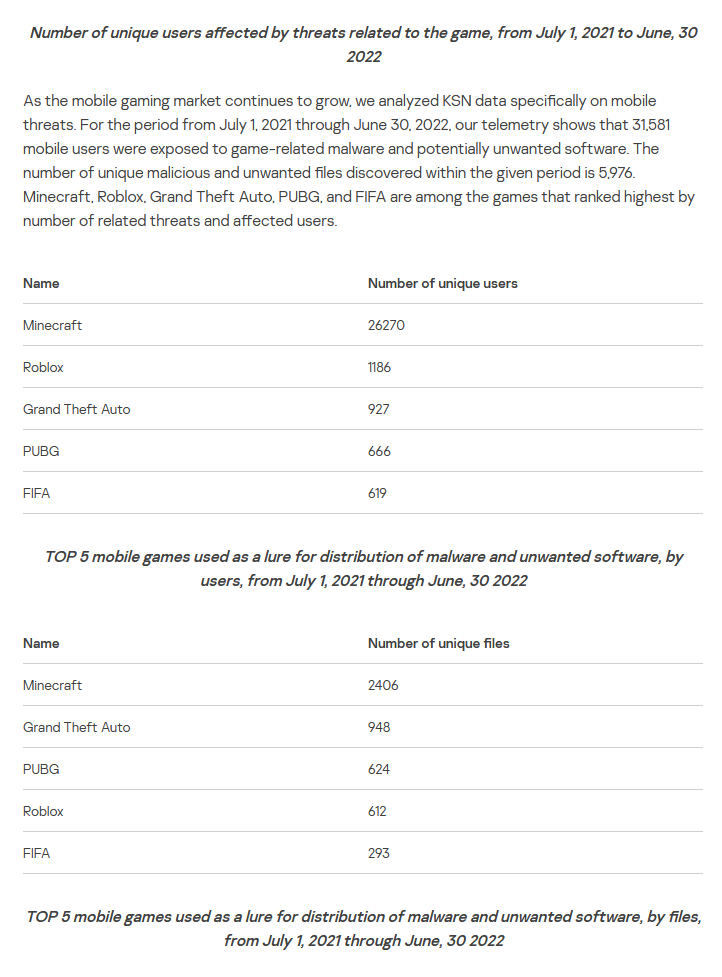 《我的世界》经常被黑客用来向全球不同用户投放恶意软件。具体来说,该公司表示,从 2021 年 7 月到 2022 年 6 月,共计发现了存在恶意诱饵的 23239 个游戏文件,影响了 131005 名用户。卡巴斯基指出,虽然在手游领域使用《我的世界》作为诱饵的恶意文件数量有所下降,但它仍然排在首位,分发了 2406 个。