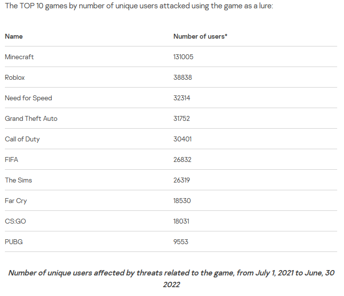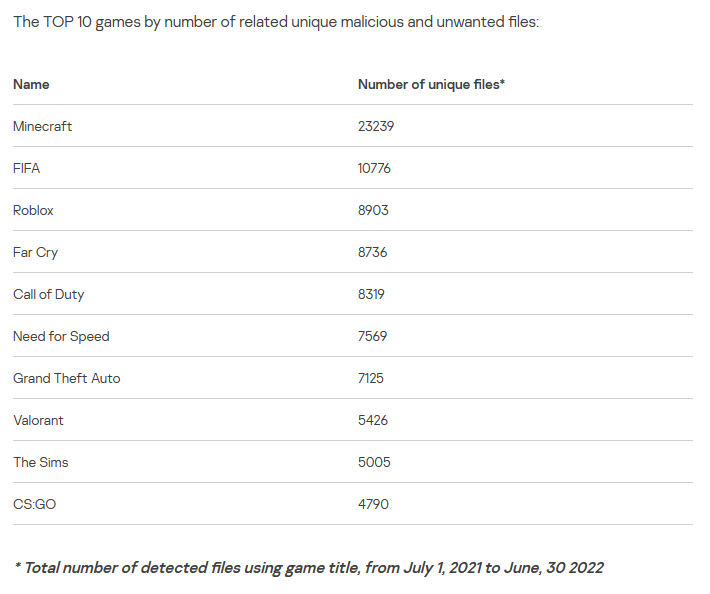 卡巴斯基在 Minecraft 之后列出了另外 9 款游戏,这些游戏在分发的相关恶意文件数量方面:FIFA (10,776), Roblox (8,903), Far Cry (8,736), Call of Duty (8,319), Need for Speed (7,569), Grand Theft Auto (7,125), Valorant (5,426), The Sims (5,005)以及CS:GO (4,790).