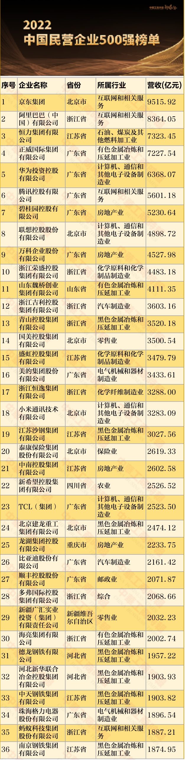 根据榜单显示,此次19家500强企业营业收入超3000亿元,其中京东集团以9515.92亿元位居第一,领先排名第二的阿里巴巴(中国)超千亿。