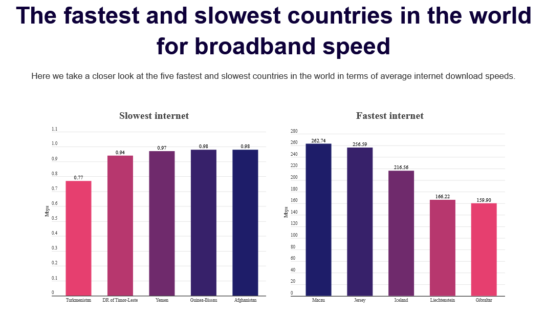 西欧国家占据了世界上宽带速度最快的前十名中的七个,澳门地区、台湾地区和日本是其他地方唯一进入世界最快前十名的地方。世界上互联网速度最快的五个区域是:澳门地区(262.74Mbps)、泽西岛海峡(256.59Mbps)、冰岛(216.56Mbps)、列支敦士登(166.22Mbps)和直布罗陀(159.90Mbps)。