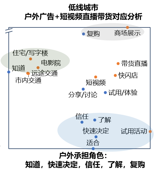 尽管大多户外媒体仍是承担认知作用,但是在物料内容布局上应要有所不同,这主要是因各城市级别的消费者对媒介角色认知不同且需求不同。此外,针对部分比较特殊的户外媒体,需要更为深刻地理解消费者的消费逻辑,协同多媒介以增强投放效果。