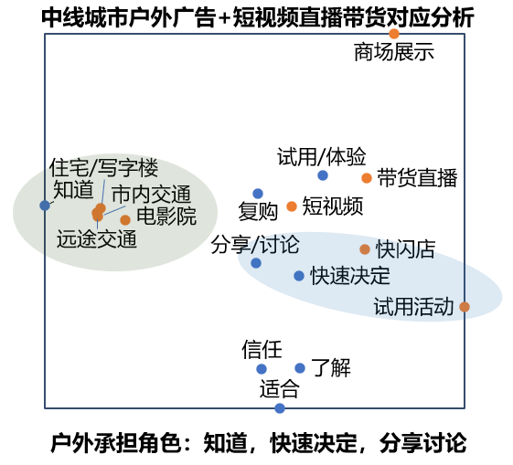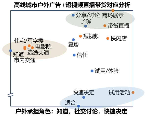 商场展示活动一种是以鼓励消费者打卡的形式引发线上社交媒体的分享与讨论,将线下与线上更为紧密地结合,因地制宜打造独特内容,并在线上获得国内各城市级别相关消费者的关注度和讨论;另一种则是与线上直播带货形式较为类似,通过商品陈列和展示的方式,让消费者直观地了解商品本身的功能。此外,因户外广告固有的场景属性,且因高线城市中消费者日常接触的信息往往偏向电子化和线上化,但正如前文所述,无论是短链决策的碳酸饮料(*线下购买:线上购买=3:1)还是线上购买已较为发达的智能手机(5:6),线下消费仍旧是高线城市中必不可少的一个消费场景。因此直接试用产品或参与相关活动,往往能让消费者通过真实且即时的体验与感受,快速决定是否购买特定的商品。