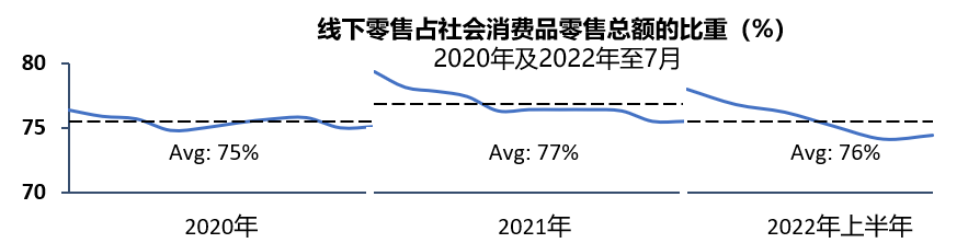 营销支出的整体收缩和今年上半年零星散发的疫情对整体户外行业造成了严重打击。户外广告与线下零售的相关性较互联网更大:2014年至2021年线下社会消费品零售总额与户外广告花费的皮尔逊相关性达到0.88,而与互联网的相关性则为0.71,因此在2022年上半年线下消费场景严重受创的情况下,户外媒体广告收入整体将暂时性承压。不过从连续三年线下零售总额的占比基本稳定在76%的情况来看,线下消费场景仍具有长期发展潜力。此外,由于品牌近几年来对线上媒体的高需求推动了线上媒体的价格涨幅,而户外媒体则因疫情影响相对处于价值洼地,随着疫情得到控制及消费者将疫情纳入常态考虑后,户外广告具有一定投资价值。