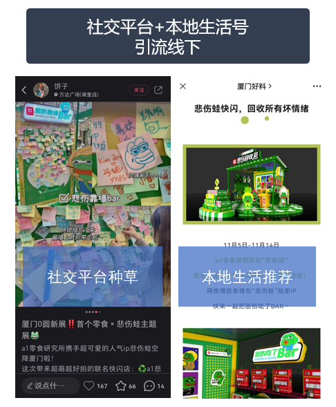 在中线城市,品牌一般通过本地生活号结合平台本地网红相结合的方式,宣传快闪或打卡活动,吸引消费者前往线下进行消费,并进一步反哺线上内容。相较高线城市,中线城市的户外广告更为强调好玩和体验,且更加具地方特色:品牌或产品更为偏向本地特有,线上讨论也基本是吸引当地人前往打卡消费,而非全国大范围的关注和讨论。