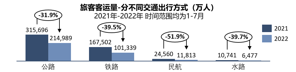 2022年上半年来看,消费者因各地疫情限制缘故,主动或被动地减少外出计划:五一期间的国内旅游出游人次和旅游收入分别同比减少30.2%和42.9%,公路、铁路、民航截至7月底均出现不同程度的同比下滑。