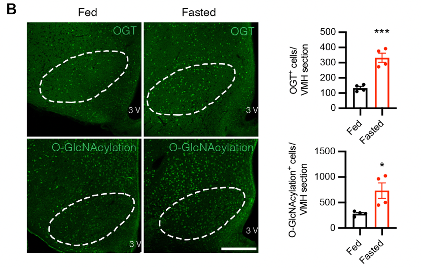 首先,为了确定是否O-GlcNAc酰化会对营养水平的改变做出反应,研究人员用禁食了24小时的小鼠与正常喂食的小鼠做对比,发现禁食能够增加腹内侧下丘脑中OGT的表达以及O-GlcNAc酰化。这一发现揭示了O-GlcNAc酰化和OGT的表达会随着能量需求的变化而变化,并且说明OGT可能具有稳定代谢的作用。
